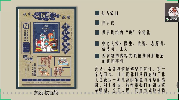 本次活动共展示作品21组,分为海报、诗歌、视频3个板块,由专业教师组成的评审团进行评分。创意海报制作组从设计灵感、设计理念、设计展示等方面出发,创作了许多别具一格、标新立异的作品;诗歌组着重强调个人感受,抒发疫情下的所思所想;视频组则落脚于居家隔离生活,在平凡的生活中创造乐趣。这些作品或将自己对抗疫英雄的敬仰与赞美融入精美画面与鲜妍色彩中,或将赞颂与感恩之情直诉于口,词致雅赡、字字珠玑,或拍摄温情脉脉的画面,行胜于声地鼓舞人心。经评审团严格评分,最终,视传1802班骆海慧的《天降奇兵》系列海报摘得桂冠,环境设计1603班李文颖的《抗疫·收官战》与项盈盈的《百战不殆》分获第二名和第三名。