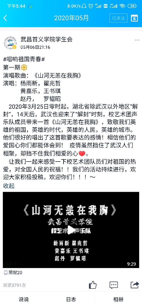 校学生会以“五四”爱国精神为主题,举办“唱响祖国青春”云歌唱歌大赛,展现首义学子青春力量和爱国热情。比赛以个人或组队方式,分两期线上报名参赛,参赛作品采用短视频方式提交,建立云歌唱专用群,目前已收到十余组优秀作品。校青年志愿者协会以“秀乡味、传乡情”为主题开展摄影大赛,广大学子通过手机镜头,展示家乡旅游、文化、历史、人文特色,表达对家乡的深深眷恋,活动共收到94名参赛者提交的235张照片和4个视频。校团委办公室以“弘扬雷锋精神,传承红色经典”为主题开展征文活动,学子们用朴实的语言、动人的细节,记录了学习生活中感动他人、温暖社会的弘扬雷锋精神的人或事。社团联合会开展的嘉年华之社团“云”个性大赛活动,通过“云”平台,展示个人、班级和社团风采,收到包括协会和个人提交的40余组参赛作品,充分展示了学生社团建设发展成果和品牌形象,发挥了学生社团在校园文化建设中的积极作用。