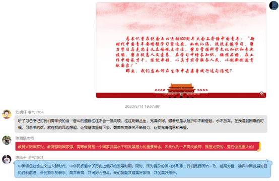 为深入学习贯彻习近平总书记对新时代中国青年的青春寄语精神,激发起广大青年为梦想不懈奋斗的蓬勃力量,引导广大青年党员进一步坚定理想信念,机电学院党总支开展了“学习总书记青春寄语,做奋发有为时代青年”主题党日活动。5月8日至20日,按照党总支部通知要求,各支部组织党员开展了线下个人自学和线上集中研讨,回顾学习习近平总书记在纪念五四运动100周年大会上的讲话,重温党的十八大以来习近平总书记的青春寄语精神,结合自身工作和学习实际畅谈心得体会。