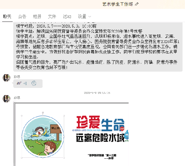 艺术设计学院及时将国务院教育督导委员会办公室2020年第1号预警传达发布至所有学工管理人员和学生班集。学院总支书记对全体辅导员进行宣讲,形成教育合力。各班级召开“珍爱生命、远离危险”主题班会,通过观看专题教育视频、制作案例警示PPT、开展知识竞赛等形式,对学生进行安全教育,要求学生做到“四个牢记”、熟记“六个不能”。同时,还利用每日安全数据统计掌握学生动向,通过“云管理”“云信息分享”加强学生日常管理和教育,确保安全教育落细落实。