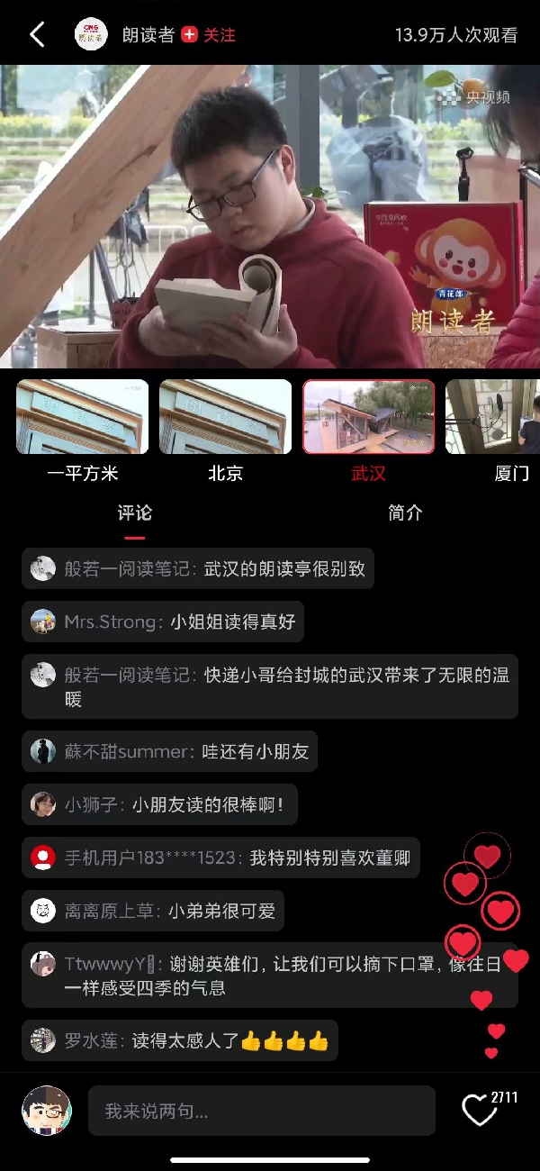 怀揣着对节目和文学作品的喜爱,叶文杰第一时间通过新浪微博完成了线上报名,并幸运地通过预约成为武汉市第三批朗读者。初读《Sonnet 18》,叶文杰不解其中真味,但在讲授英国文学的王华英老师指导下,他慢慢读懂了其中的深意。“我想通过这首诗,唤起人们内心对爱情的向往,传递正确的爱情观。”叶文杰通过“央视频APP”线上直播间,把自己的心声传递给了13.3万观众。