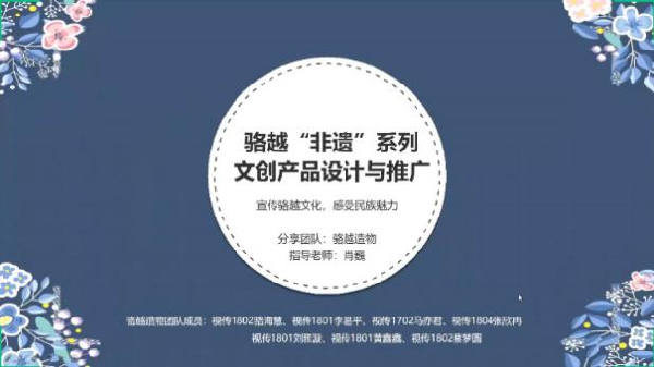 分享会邀请创新创业大赛获奖项目 《骆越造物——非遗文创产品开发研究》和《白雪阳春——荆楚文化产品开发研究》两个项目团队作交流分享。获得2020年湖北省“互联网+”大学生创新创业大赛铜奖、挑战杯创新创业大赛省级铜奖的“骆越造物”项目团队成员,通过图片、视频等多种形式,为大家分享了宝贵的项目经验。获得2020年挑战杯创新创业大赛省级铜奖的“白雪阳春”项目团队及指导老师张钰,与大家分享了项目过程及心得。“骆越造物”团队所涵盖的骆越文化、基于少数民族文化进行文创产品创作的思路以及“白雪阳春”团队所涵盖的荆楚文化均引发师生共鸣,其中的创新点也触发项目团队成员创作上的头脑风暴。