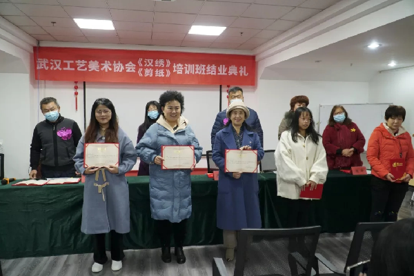 12月2日,武汉工艺美术协会汉绣培训班结业典礼在武汉美术工艺大楼举行。此次汉绣培训班由武汉美术工艺协会承办,特邀各院校教授、中国刺绣艺术大师、湖北省工艺美术大师、汉绣代表性传承人作为授课老师,对学生进行为期30天的集中授课。我校视觉传达设计专业承芹老师、庞迎庆老师以及10名毕业班学生参加了培训,其中视觉传达设计专业1703班周卓灵同学获评“汉绣优秀学员”。