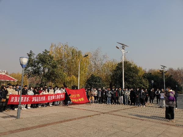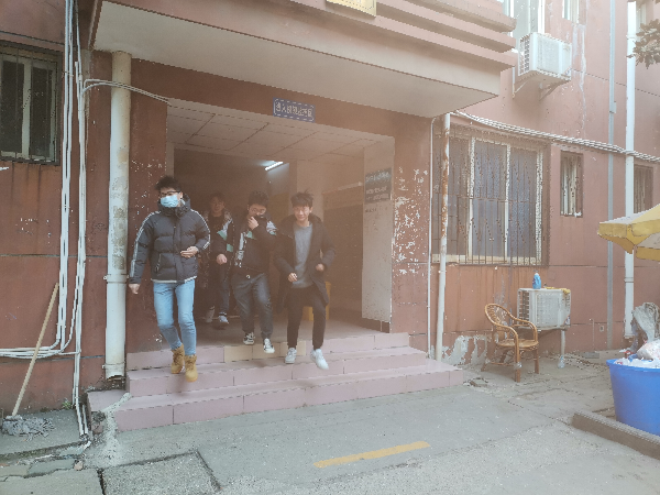中午12点15分,随着警哨声响起,南区13栋638寝室冒出浓烟,参与演练的各楼层安全员紧急吹哨,敲开寝室房门,疏散楼栋同学。3分钟内,全体学生逃离“火场”,并转移到体育馆空地进行逃生知识和消防灭火知识学习。