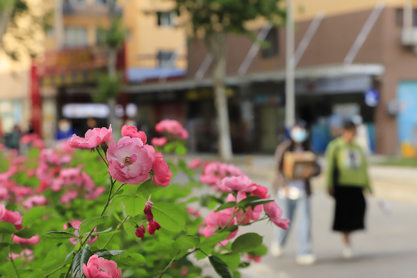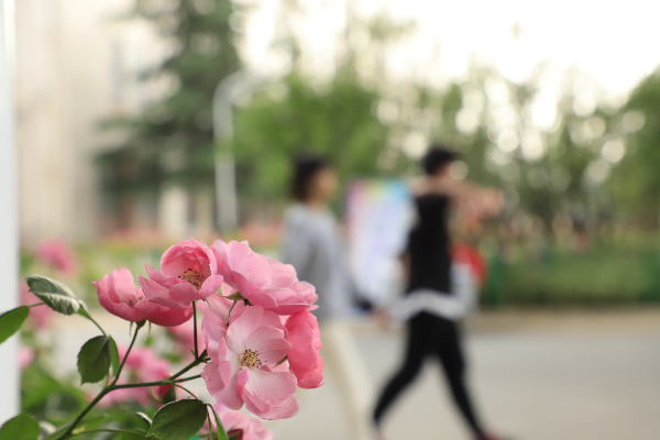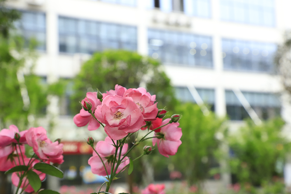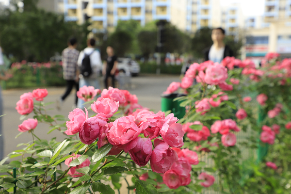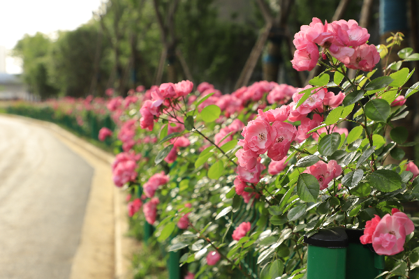“绿刺含烟郁,红苞逐月开;朝华抽曲沼,夕蕊压芳台。”近日天气回暖,百花齐放,贯穿校园的杨泗港大桥路段两侧,月季花也悄然绽放了。绿色粉蕊攀依在栅栏上,绵延至大桥尽头,在校园里铺开了一条春意盎然的“鲜花路”。这条“鲜花路”连接学校中、西两区,也是学生前往11栋教学楼上课的必经之路。粉嫩婀娜的花朵散发着淡淡的清香,让每一个走在上课路上的学子心旷神怡。不少学子忍不住拿起手机,与花儿来一张“亲密合影”。