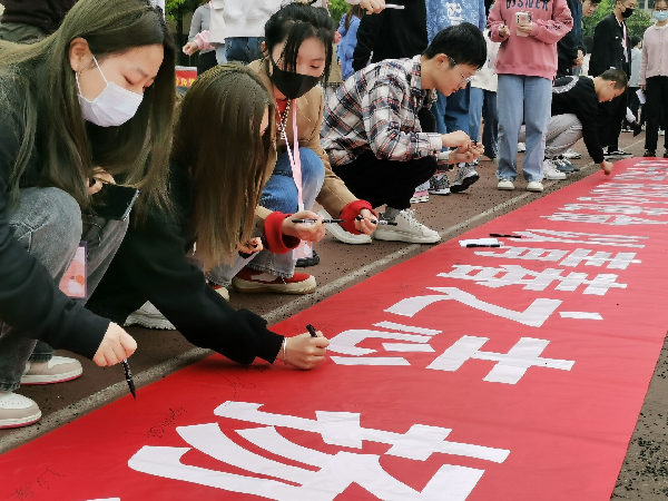 仪式结束后,同学们纷纷在“忆百年荣光 铭初心使命以青春之志扬爱国之情”横幅上签名,表达自己践行誓言的决心。