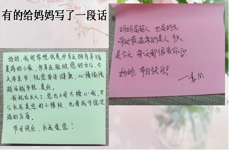 5月8日,学生会将收集到的照片进行了集中展示,同学们在活动现场填写心愿卡,写下自己最想对妈妈说的话以及对妈妈的祝福。“祝母亲节日快乐!”“希望妈妈永远年轻!”一张张心愿卡虽小巧,却承载了同学们对母亲的深情。5月9日母亲节当天,同学们通过手机和网络为妈妈送上了节日礼物和祝福。会计2019级和市营2019级的同学们在晚点名时,拍摄了“听我说谢谢你”手势舞,并在歌曲结束时齐声祝福:“妈妈你辛苦了,母亲节快乐!我们爱你!”