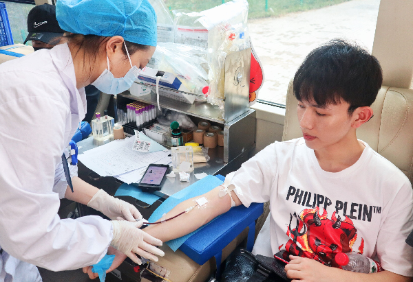 上午九点十五分,志愿者们身穿红马甲,提前来到活动现场做好准备工作。十点整,前来献血的同学有序排队填表登记,并在体检初筛合格进行献血。他们中,有多次献血的高年级同学,也有首次献血的新同学。第一次担任献血志愿者的刘振超表示,自己有过三次无偿献血经历,此次参加志愿服务,也是希望能带动更多同学加入到无偿献血的行列中,让青春在奉献中闪耀光芒。
