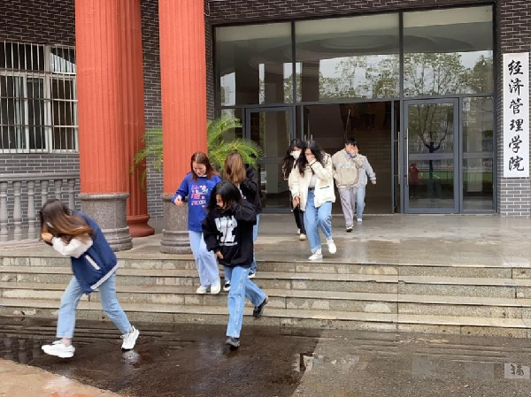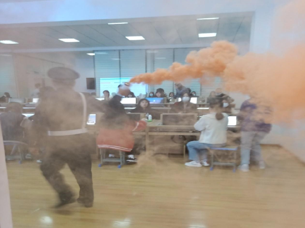 上午10时,国际经济与贸易跨境电商实训室内烟雾燃起,全体实验员、辅导员和学生安全员迅速就位,引导正在“上课”的同学用毛巾捂住口鼻,弯腰、低姿迅速从三个逃生门撤离至安全区域。