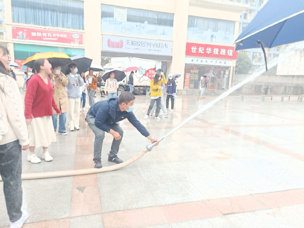 随后,张智松老师对同学们进行了消防安全教育,就如何拨打火警电话、如何安全逃生自救、如何正确使用灭火器、如何正确使用消防水带进行了细致讲解,并教给同学们“一拉栓塞二拔管子三喷粉”口诀。