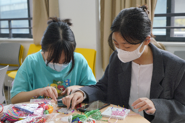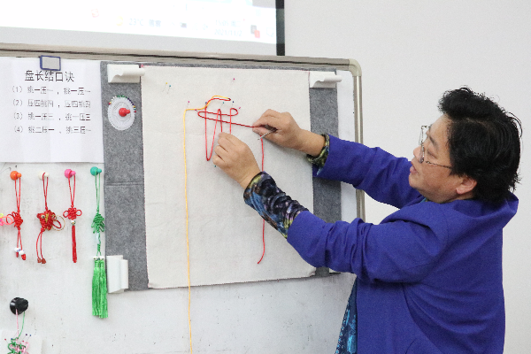三天时间里,印迎春为同学们讲授了手链蛇结和长结、四道盘长及六道盘长的制作技法,同学们按照“挑一压一,压四挑四”等口诀,专心制作。印迎春悉心指导,手把手教授,通过一遍遍演示纠正同学们的手法。