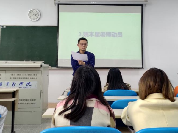 班会上,姚本星老师为同学们作考研动员,说明了考研的必要性和重要性,鼓励大家努力奋斗,实现梦想。程聪老师结合多年考研指导工作经验,为同学们讲解了如何做好考研规划以及报考和备考注意事项。肖奥和吴晓婵分享了自己的考研实战经验,向同学们介绍了学习方法和应考技巧。