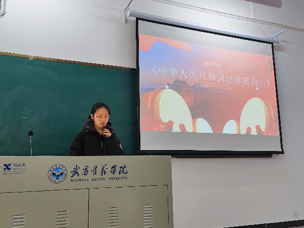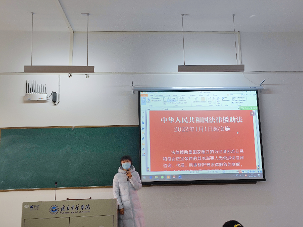 “惠民新法人人晓”是此次宪法宣传的重点内容。在老师和法学2105班杨晴晴同学的共同宣讲下,同学们认真学习了《中华人民共和国法律援助法》相关知识,从背景、主体内容、立法意义等方面全面深刻地了解了法律援助的目的和重要意义。