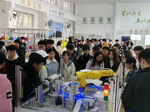 参观过程中,2021级新生仔细看、认真听、详细记,通过高年级同学的引导及介绍,对智能制造产教融合创新实践教学基地各区域的设备、功能及所开设的课程进行了了解,并且在与高年级同学的座谈中,表达了对返回武昌校区学习专业知识的期盼。