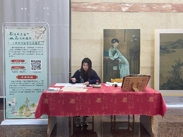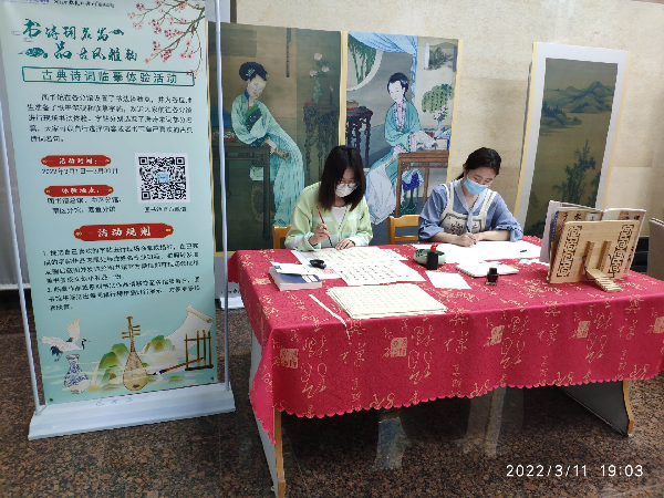 “书诗词名篇品古风雅韵”。在看书赏画的同时,图书馆还设置了古典诗词临摹体验活动,师生可在各分馆体验点挑选自己喜欢的字帖进行现场临摹或描红,在书法艺术中感受诗韵之美。