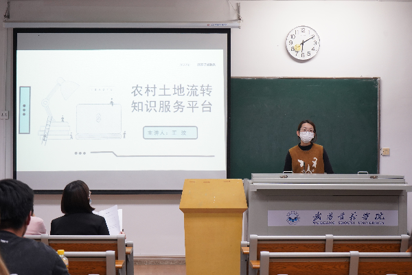 现场答辩环节,24支队伍分为两组,分别在两个教室陈述并作PPT展示。各参赛队伍围绕校园电商、“三农”电商、服务电商、旅游电商以及AI、5G等选题进行8分钟陈述,之后由评委进行7分钟现场提问。