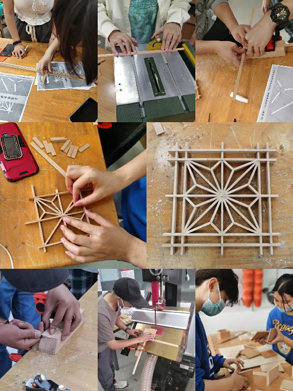 组子细工( Kumiko )是日本传统木工工艺,类似中国木工中的花格工艺,主要应用于建筑、拉门、屏风和器物之上。本次创新组子细工技能培训将木艺加工与设备相结合,通过选料、开料、精切、划线、角度锯切、开槽、制榫、组装、打磨等一系列工艺,帮助同学们熟悉带锯、小型推台锯、打磨设备砂光机、砂带机、曲线型精确锯切机、低振幅精确锯切机、车床系统、专业木工台等机械设备的操作,结合传统手动工具(锯、刨、划线、凿、锉)来完成组子细工和榫卯相结合的制作过程。