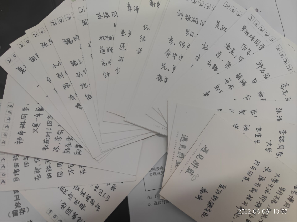 活动伊始,辅导员秦琦带领班委组织各类活动,与毕业生们一起重温大学四年美好时光。点球大战、套圈、猜歌……各类团建小游戏中,大家用欢声笑语冲淡离别伤感。之后,大家还分享了各自毕业季的所见所感,辅导员还为所有毕业生送上了亲笔书写的明信片。211张明信片朴素而温馨,承载了师生之间的真挚感情,也饱含着对毕业生们的美好祝福:用脚步丈量祖国大地,用内心感应时代脉搏,不负韶华,不负时代,继续在青春的赛道上奋力奔跑。