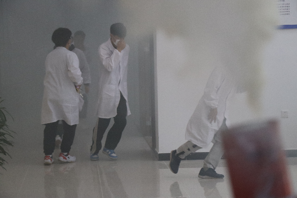 消防逃生演习中,随着学院实验楼内白烟腾起,警铃骤响,现场老师迅速行动,有条不紊地对学生进行疏散。同学们则用湿毛巾捂住口鼻,规范有序撤离。五分钟内,所有学生全部撤至实验楼外安全地带。