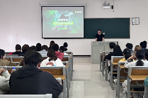据悉,武汉博思宇宙数字科技有限公司成立于2006年,是全球闻名的游戏、影视开发制作公司。会上,刘建向新生详细介绍了游戏行业的用人需求,以及不同美术岗位应具备的能力,帮助学生清晰了解行业人才需求和发展前景,更好地开展专业学习与实践。他还通过宣传片和商业案例介绍,展示了博思游戏产业的行业实力,并热情地为同学们答疑解惑。