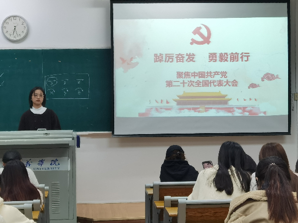 辅导员李梦蝶通过多媒体,带领同学们回顾了党的十八大以来党和国家事业发生的历史性变革和取得的历史性成就,并结合党的二十大报告中有关青年、教育、创新的论述,分享了自己的学习感悟,激励同学们将个人发展与国家需要结合起来,把个人理想融入到中华民族伟大复兴的历史进程中,争做有理想、有能力、有担当的新时代青年。