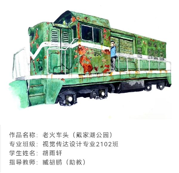 本次写生实践活动中,艺设学子以校内风光和校外风景为写生对象,创作了大批优秀写生作品。其中,视觉传达设计专业2102班的胡雨轩走近自然,选取戴家湖公园的老火车头作为绘画对象。在老师指导下,胡雨轩准确把握色彩规律和色彩感觉,在其创作中,一列饱经风霜的“老火车头”跃然纸上。