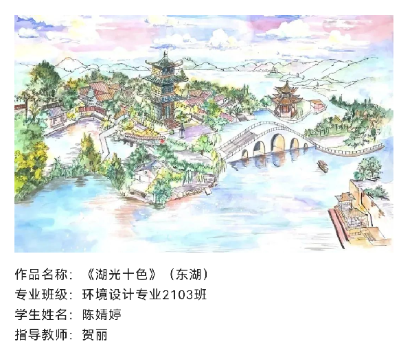 环境设计专业2103班的陈婧婷以东湖风光为写生对象,合理进行环境色彩概括、提炼和分析,在对物象远近距离、冷暖规律的观察分析和研究中,找到合理且丰富的层次空间,运用于实践作品中。
