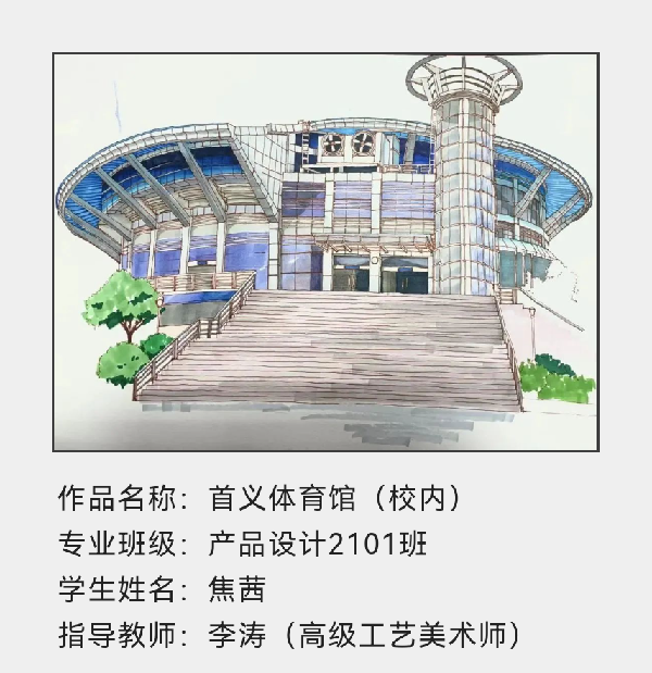 产品设计专业2101班的焦茜深入校园各处,体会不同自然光与色的关系和物体之间相互色彩变化,其画笔下的体育馆仿佛破画而来。