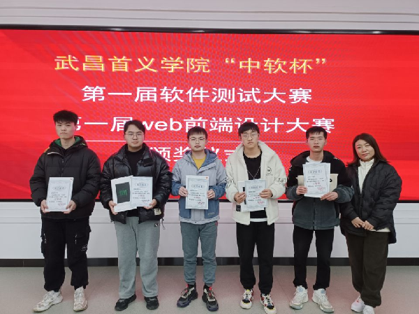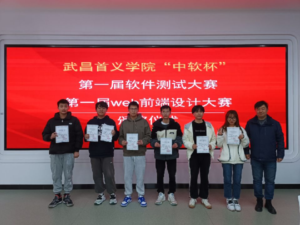 张硕老师和罗旋老师宣读了第一届软件测试大赛及第一届web前端设计大赛获奖名单,梁意文、赵瑜、汪晓航、任凯等共同为获奖学生颁奖。