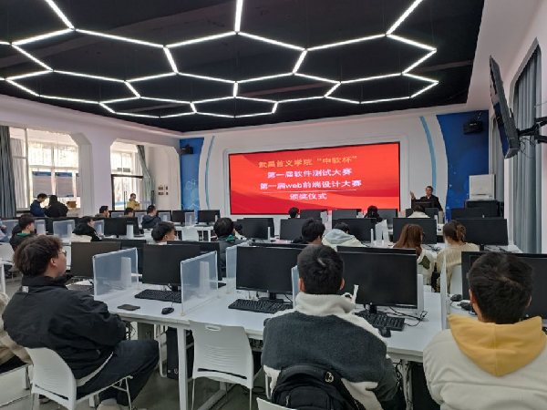 2月27日中午,武昌首义学院“中软杯”第一届软件测试大赛及第一届web前端设计大赛颁奖仪式在信息实验大楼105举行。信息科学与工程学院院长梁意文、党总支书记赵瑜、副书记汪晓航、计算机系主任刘智珺,中软项目经理、校企合作班优秀讲师任凯,全体竞赛指导教师和获奖学生参加了颁奖仪式。