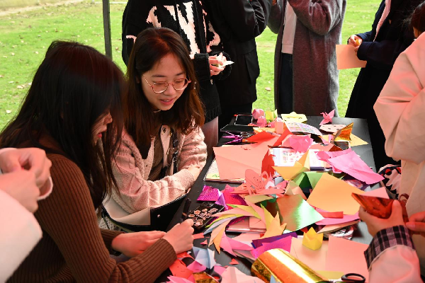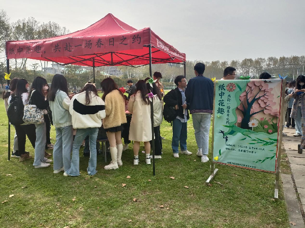 为丰富校园文化生活,提高学生的动手能力,新闻与文法学院于3月27日在成学楼草坪举办“纸中花趣,共赴一场春日之约”剪纸活动。