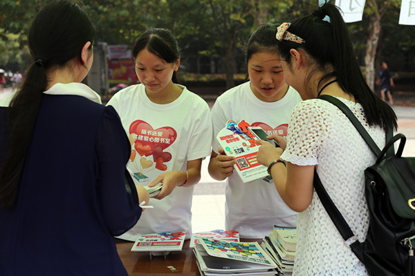 该活动于上午11点在中区广场正式开始。我校新闻中心的学生记者们热情参与,不仅在学校微博上宣传了这次公益活动,还在学校广播站中播出了活动详情和参与方法。很多同学回宿舍整理出自己的书籍,特意送到活动现场。短短半天时间,便募集到各种图书300余册。前来捐书的我校13级新媒体专业的张同学表示:“有些书用不着,放在寝室也是浪费,还不如拿出来捐给那些需要帮助的孩子们!”