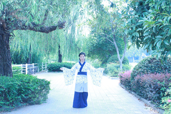 这件被多人争抢试穿的曲裾是汉语言专业1301班的杜小蕾在暑期亲自缝制而成。制作之前,她多次上网观看制作曲裾的方法,并拿家里不常用的床单进行裁剪和缝制,待一切准备就绪后,便在家附近的布店里买了两块布,其中,一块类似青花瓷的花布用来制作裙裾上衣,另一块纯深色的布用以制作下裙。为了能缝制出更好的曲裾,她还购买了一台迷你型缝纫机。